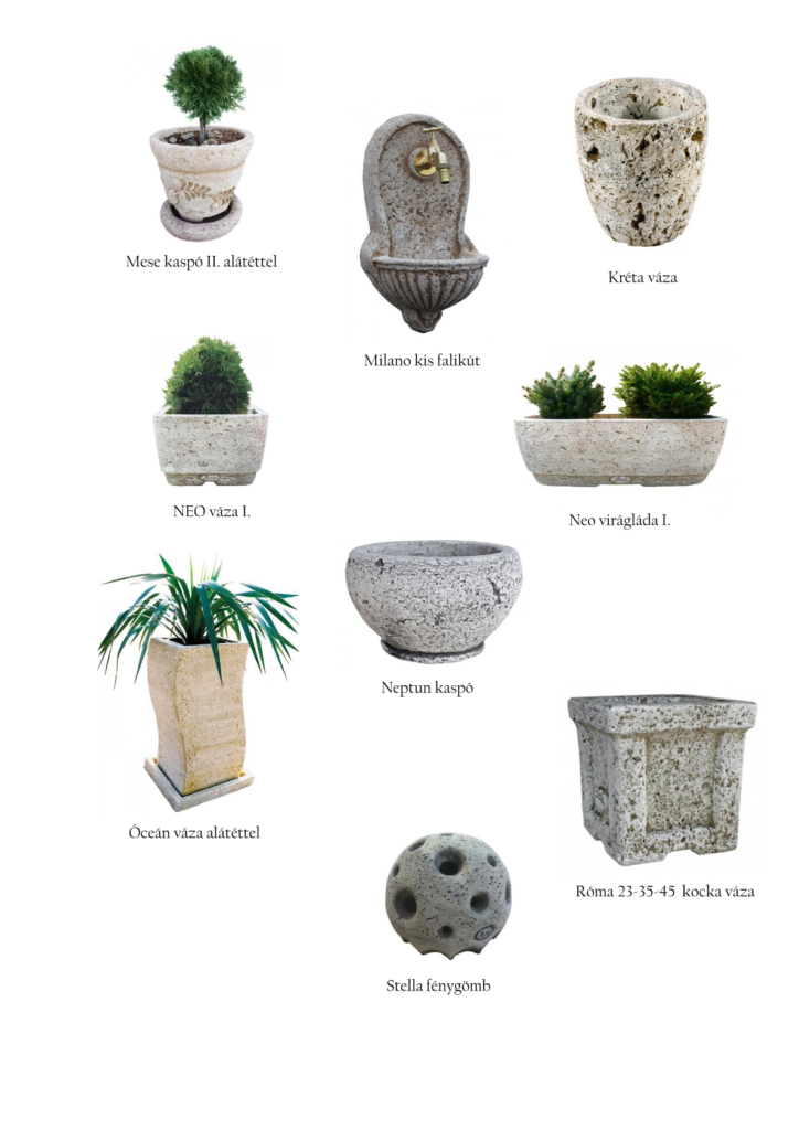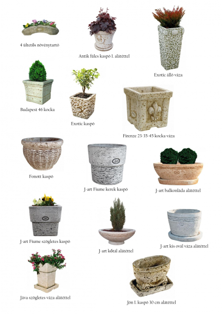 | típus | 4 ültetős növénytartó, Antik füles kaspó I. alátéttel, Exotic álló váza, Budapest 46 kocka, Exotic kaspó, Firenze 23 kocka váza, Firenze 35 kocka váza, Firenze 45 kocka váza, Fonott kaspó, J-art Fiume kerek kaspó, J-art balkonláda alátéttel, J-art Fiume szögletes kaspó, J-art kőtál alátéttel, J-art kis ovál váza alátéttel, Jáva szögletes váza alátéttel, Jón I. kaspó 30 cm alátéttel, Mese kaspó II. alátéttel, Milano kis falikút, Kréta váza, NEO váza I., Neptun kaspó, NEO virágláda I., Óceán váza alátéttel, Stella fénygömb, Róma 23 kocka váza, Róma 35 kocka váza, Róma 45 kocka váza |